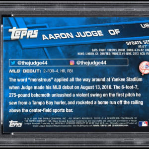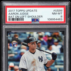 Graded NM-MT 8 by PSA. How many more homers will New York Yankees superstar Aaron Judge slug in 2025? Regardless of the final tally, the offered 2017 Topps Update #US99 rookie variation is a prime value pick! This "Bat on Left Shoulder" short print pictures #99 looking to send yet another ball into the bleachers.