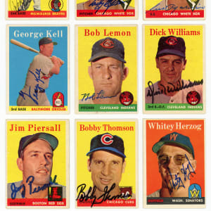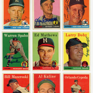 Auction LOA from James Spence/JSA: (27 cards) with #2 Lemon (reverse paper loss), #9 Bauer, #20 McDougald, #40 Kell, #45 Groat, #70 Kaline, #79 Di. Williams, #85 Aparicio, #100 Wynn (reverse tape), #101 Richardson, #115 Bunning, #120 Podres, #142 Slaughter, #190 Schoendienst, #238 Mazeroski, #258 Erskine, #270 Spahn, #280 Piersall, #320 Ford, #340 Newcombe, #343 Cepeda RC (reverse writing), #409 F. Thomas, #419 Shantz, #424 Doby, #430 Thomson, #438 Herzog, #440 Mathews;