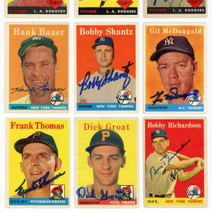No JSA but Presumed Authentic: (272 cards) with #4, 6, 8, 10-13, 15, 17, 18, 22-24, 26-29, 31, 32, 35, 37-39, 41, #42 Roseboro, 46, 48, 50, 53-59, #61 Da. Johnson, 62, #63 Nuxhall, 67-69, 72-74, 78, 81, 82, 84, 87, 89, 91, 94-96, 98, 99, 102, 103, 105, 106, 108-114, 117, 119, 121-127, 129, 131, #132 Law, 133, 135, 137, 140, 143, 144, 146, 148, 149, 151-153, 155-157, 159, 164, 167-169, 173, 176, 177, 179, 180, 182, 184, #185 Boone, 188, 191-195, 197-202, 206-211, 213, 214, 217, 220-224, 226 (also signed on back), 227, 231, 232, #233 Vernon, 236, 237, 239, #240 Skowron, 241, 242, 244, 245, 247, 250, 251, 253-255, 257, 259-263, 266, 269, 272-274, 276, 277, 279, 281, 282, 284, 286, 290, 292-294, 296, 297, 301-303, #305 Labine, 308, 309, 311, 313, 315-319, 323, #325 Adcock, 328-333, 338, 339, 342, #352 Score, 354, 356-358, #360 McMillan, 361, 363, 364, 367, 369, 371, 373, 374, 376, 378-381, 383-385, 388-392, #394 Grant RC, 395, 396, #398 Woodling, 399, 402, 403, 405, #406 Power, 411-413, 422, 423, 425-427, 429, 431, 432, #435 Roebuck, 437, 439, 441, 443-446, 449, 450, 452-455, 457-459, 461, 463, 467-473